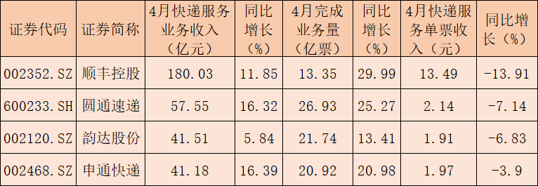 总体来看,已发布4月经营简报的4家快递上市公司在该月均实现了收入和业务量的同比增长,顺丰控股、申通快递和圆通速递这三家公司更是均实现了两位数的同比双增长。